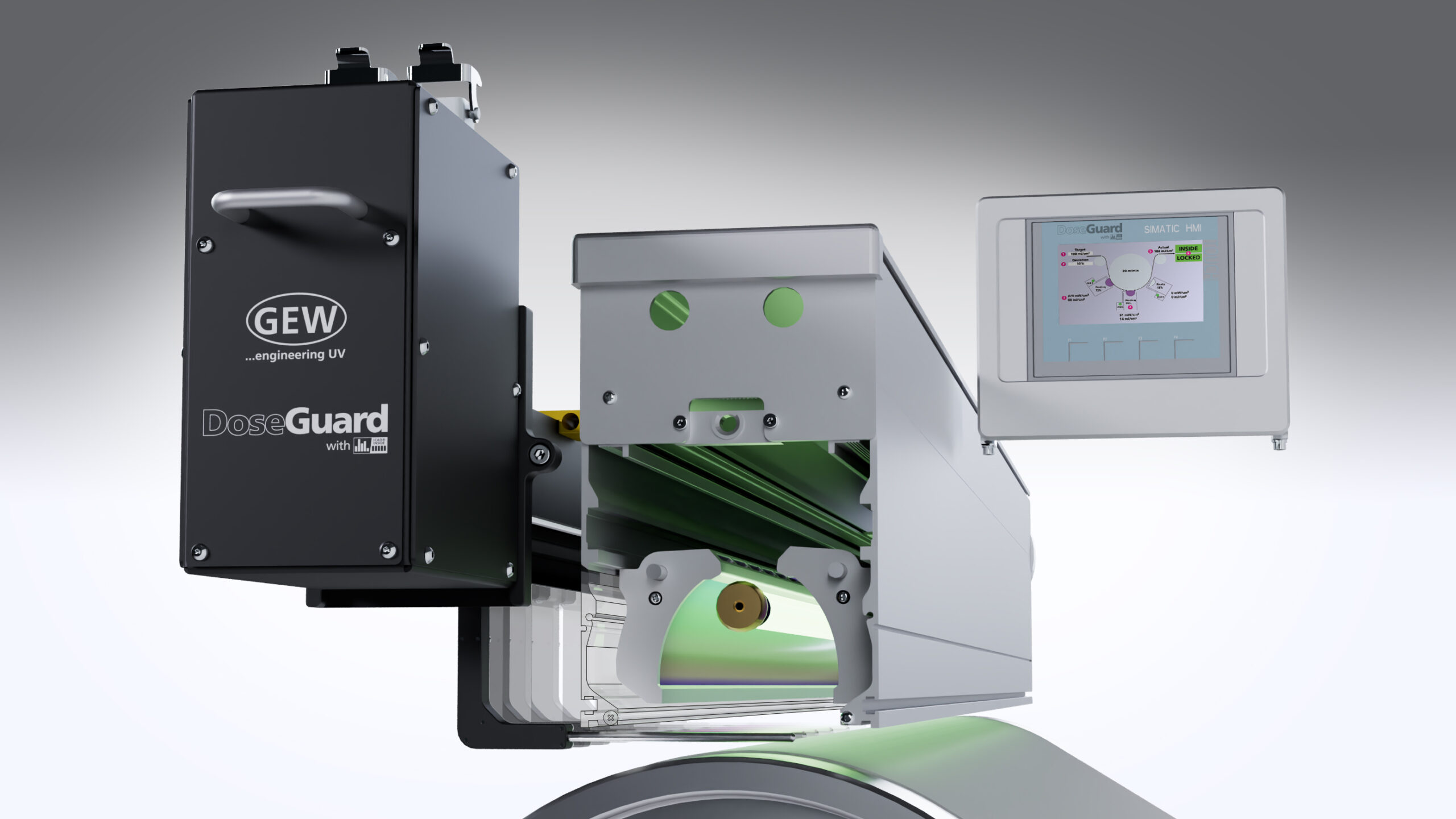 The third innovation from GEW is DoseGuard, which will also be launched at Labelexpo. DoseGuard, powered by ICAD® technology, delivers inline UV monitoring and automatic UV dose control. It consists of a scanning optic (ICAD unit) which is mounted underneath each of the lampheads on a UV system, whether conventional UV Arc or UV LED. DoseGuard continuously measures the UV light that reaches the substrate, across the entire width of the system, and will issue a warning if the level of UV output delivered to the substrate changes during production, for any reason.